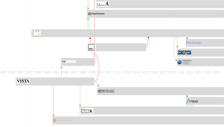 Our infographic below shows how the 50 largest expert networks have grown, merged, and emerged from one another.