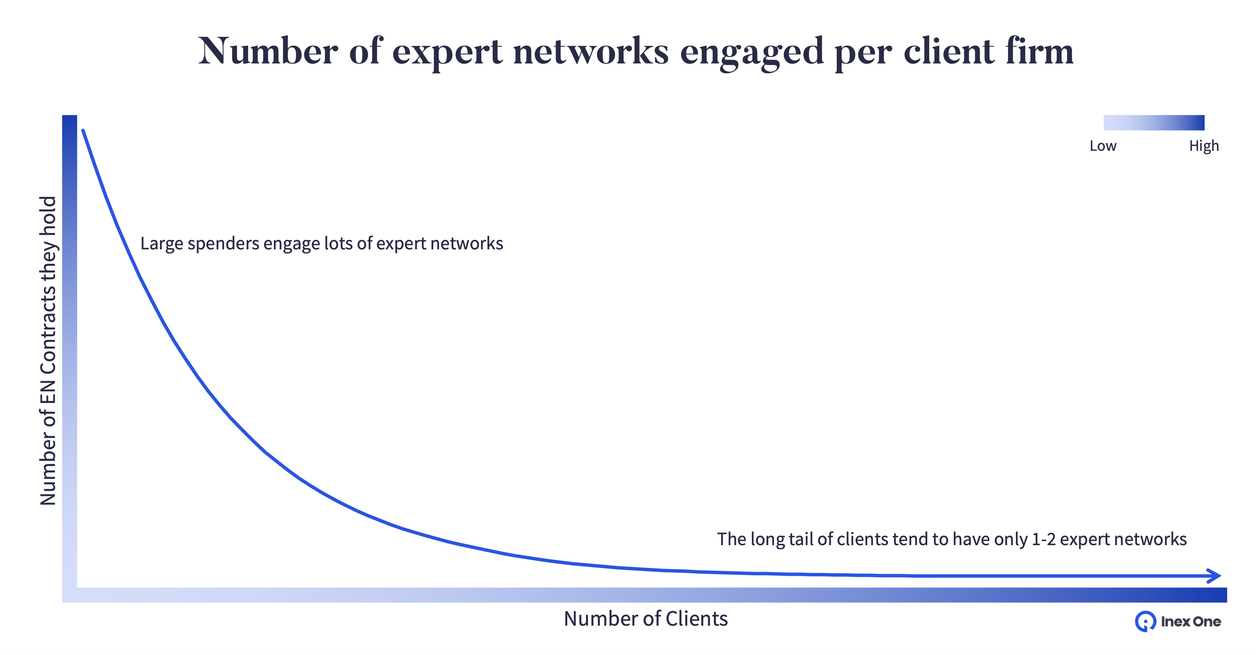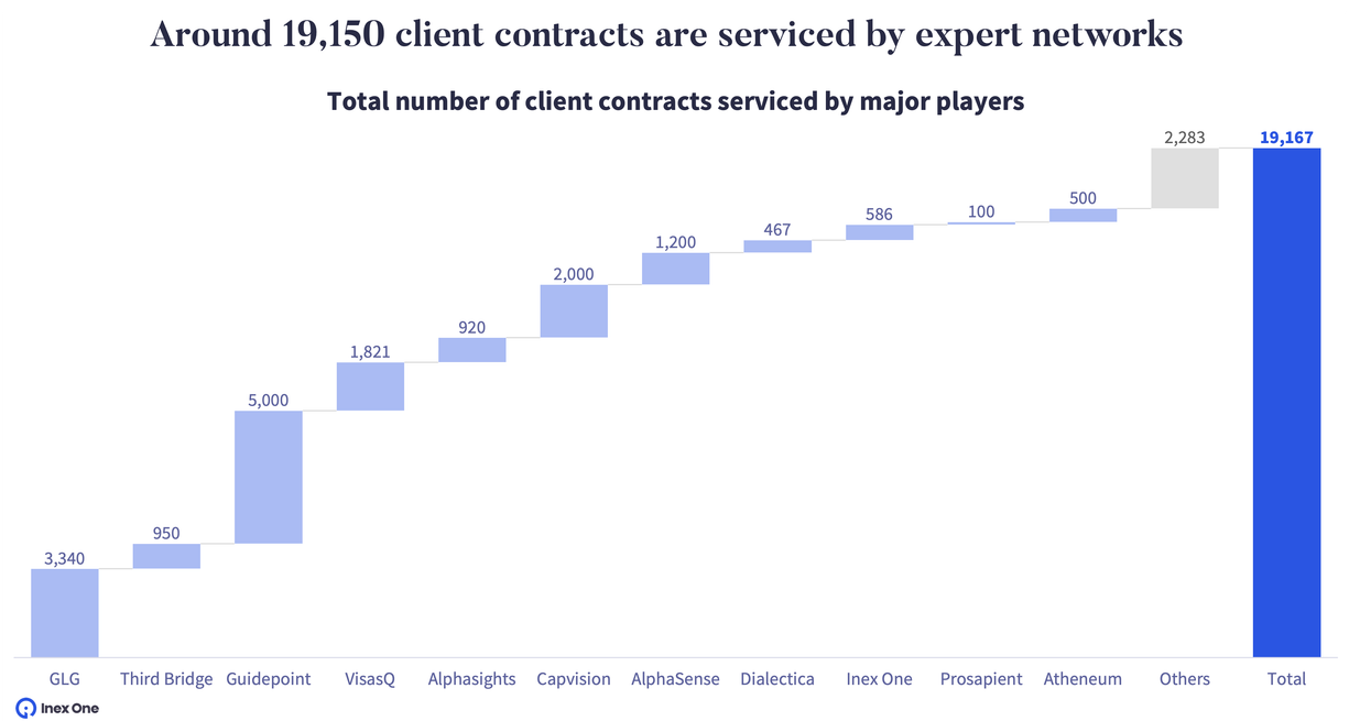 In total, compiling data from these 10 major networks, plus Inex One’s own figures, gives a preliminary total of ~16,900 client-expert network contracts (88% of the market). If we extrapolate this to 100% of the market, it gets us to ~19,150 client contracts in total.