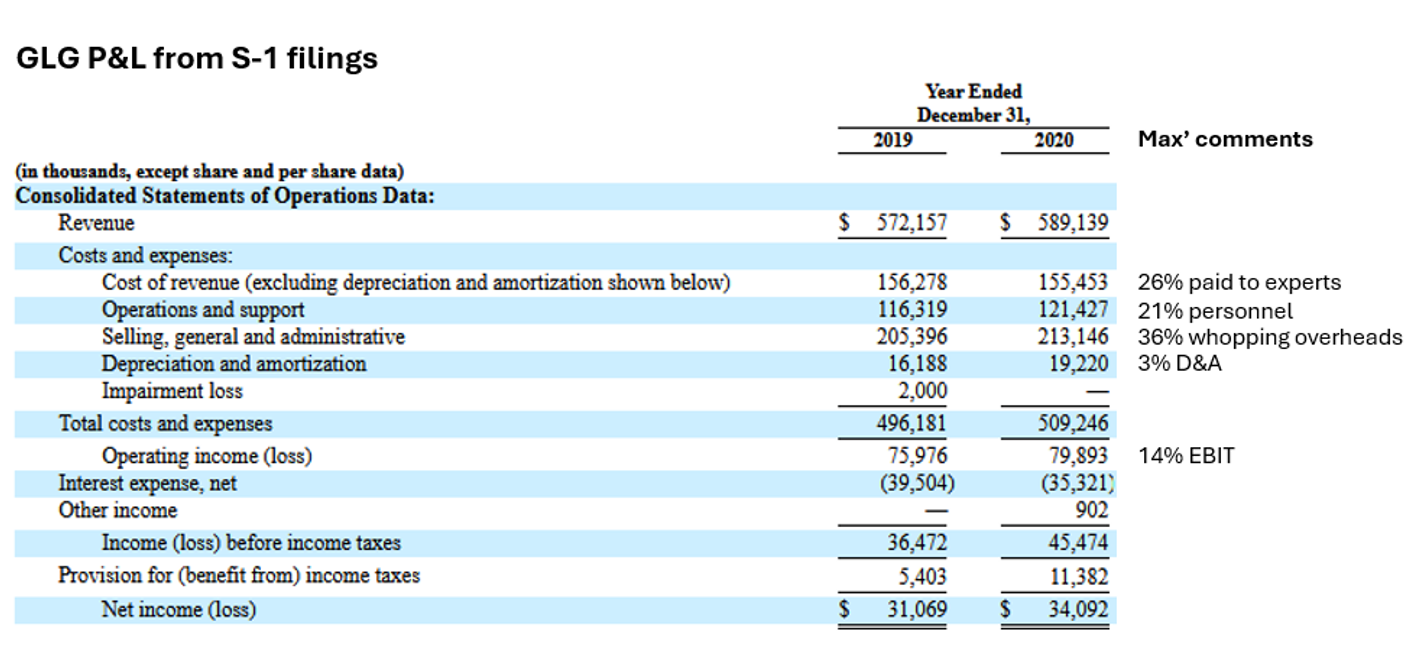 Now, if consultants think expert interviews are a pain to arrange – you should see the other guy. Expert networks suffer from inefficient admin work, too. Let’s quantify this by looking at GLG's P&L statement from its 2021 IPO attempt, at the time the leading expert network.