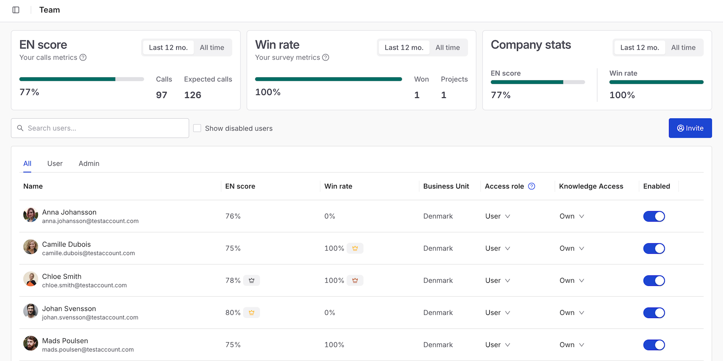 Top Performers: See the top 3 performers in your organization for both EN Score and Win Rate.
