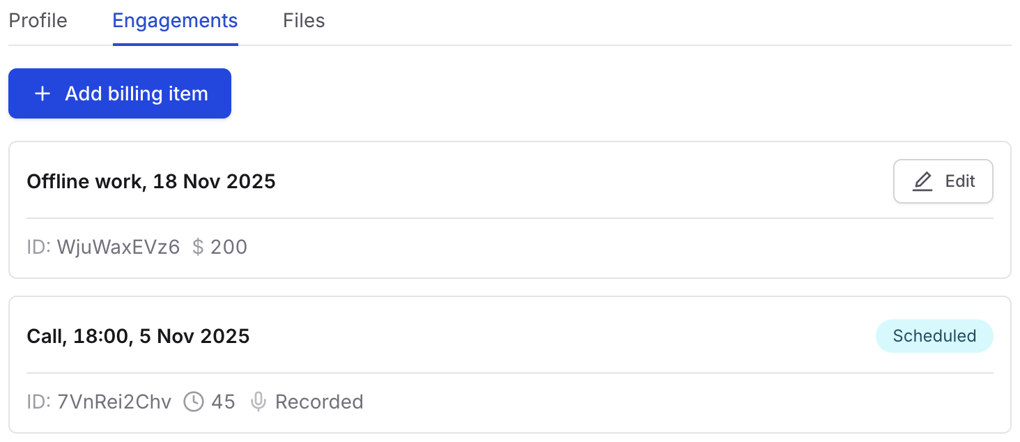 Non-call items e.g. offline work or translator costs for an expert, will now be listed under the Engagements tab. Anything added will be visible on billing pages and invoices.
