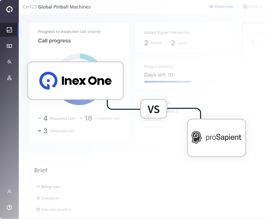 * Prosapient obscures its true pricing by charging for “credits”. While the price per credit may be lower, Prosapient routinely charges multiple credits per expert call. This makes the true price higher. For comparison, Inex One’s prices are only quoted in the currency of your choice (USD, EUR, GBP etc.), with median historic prices being $1,150/h when including "premium" experts. See our explainer on expert network pricing here.